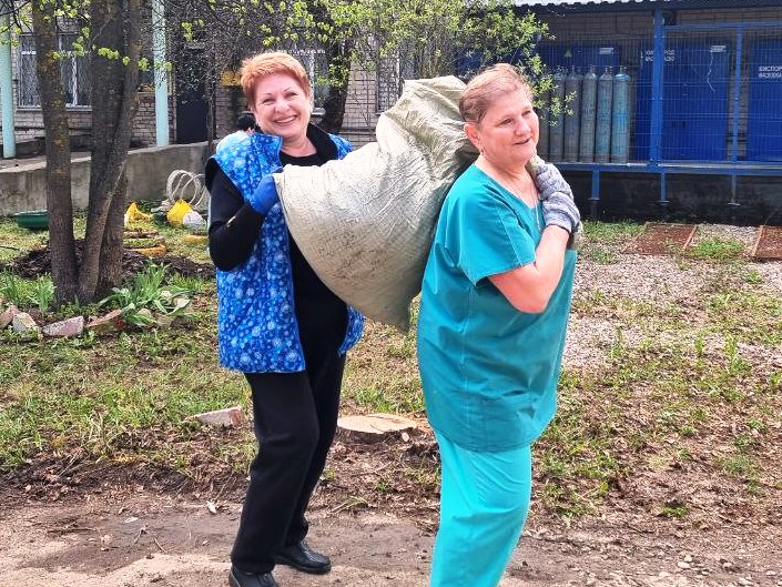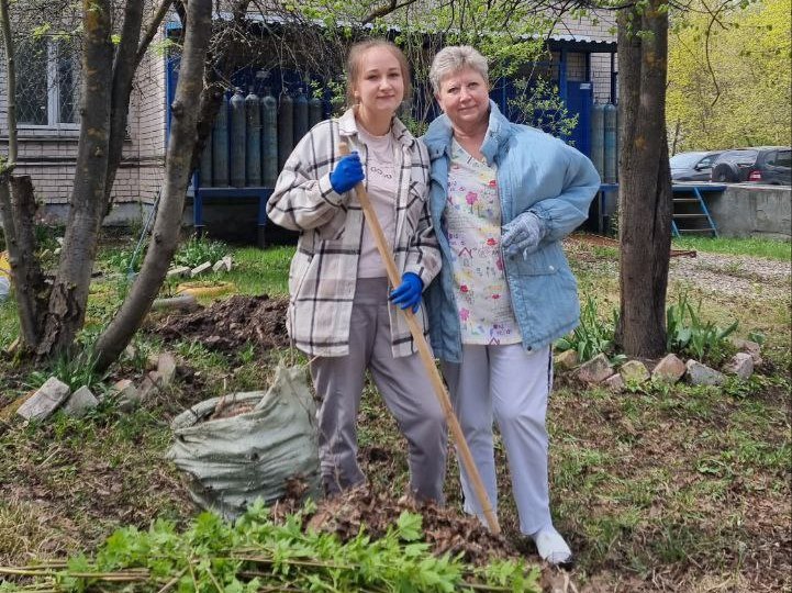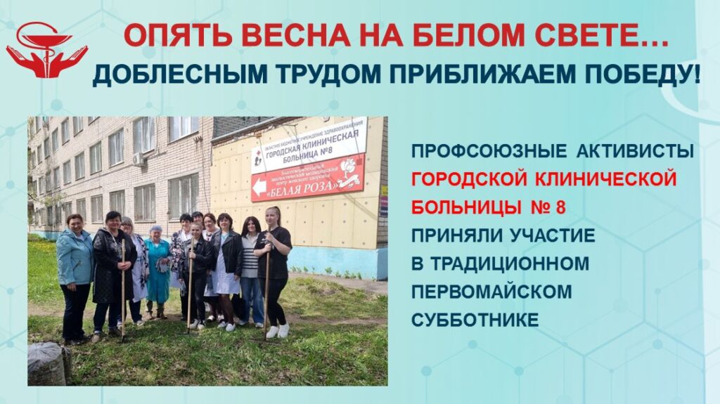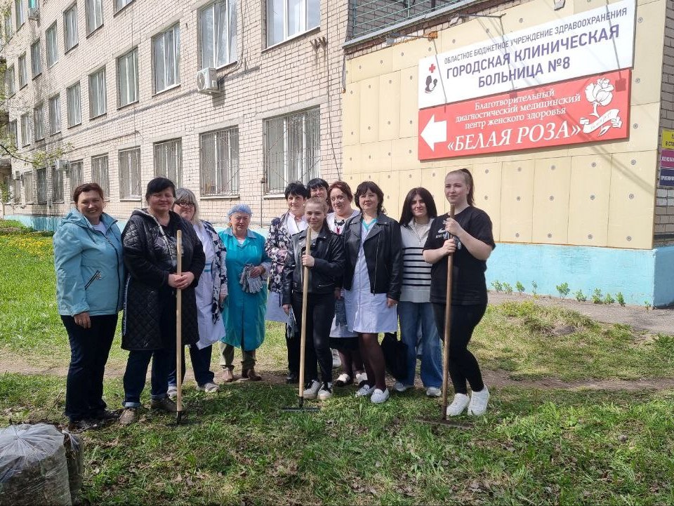 В рамках ежегодного месячника по охране труда члены первичной профсоюзной организации ОБУЗ «Городская клиническая больница № 8» совместно с администрацией больницы и главным врачом ЛОСЬ Мариной Сергеевной приняли участие в традиционном масштабном субботнике на территории больницы.