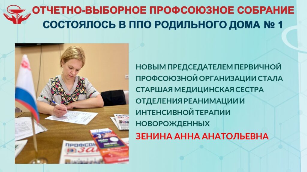 Новым председателем первичной профсоюзной организации стала ЗЕНИНА Анна Анатольевна, старшая медицинская сестра отделения реанимации и интенсивной терапии новорожденных.