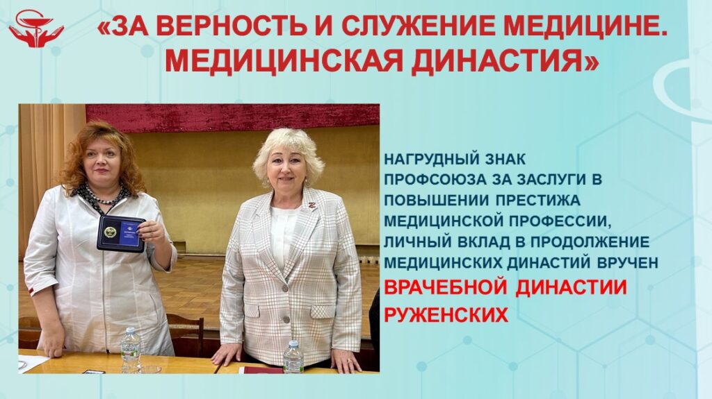 Председатель Ивановской областной организации Профсоюза работников здравоохранения РФ ВАЦУРО Галина Владимировна вручила семейной династии врачей нагрудный знак «За верность и служение медицине. Медицинская династия», утвержденный Профсоюзом здравоохранения России, за заслуги в повышении престижа медицинской профессии, личный вклад в сохранение и развитие лучших традиций в семьях, продолжении медицинских династий.
